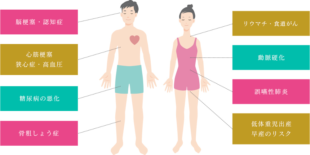 さまざまな研究により、歯周病は全身の健康に悪影響を及ぼすことがわかっています。歯ぐきの血管などから体内に侵入した歯周病菌は、血液の流れに乗って体中を巡り、脳梗塞や心筋梗塞、糖尿病といった深刻な病気や、低体重児出産、早産のリスクを高めてしまいます。最近では骨粗しょう症、認知症や誤嚥性肺炎との関係も指摘されています。