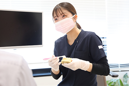 予防ケアの中心は毎日のお手入れです。歯みがきの方法やデンタルフロスなどの選び方・使い方、さらにお口の健康に関わる食習慣についても、専門家の視点でアドバイスを差し上げます。