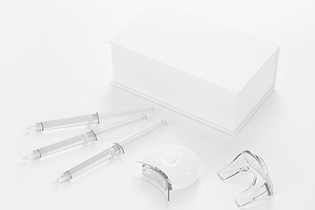 ご自宅などで患者さん自身に行っていただくホワイトニングです。お口に合わせて作製したトレイと呼ばれるマウスピースに薬剤を入れ、一定の時間装着していただきます。使用できる薬剤の濃度がオフィスホワイトニングに比べて低いため、効果の現れは緩やかですが、長持ちする白さが特徴です。